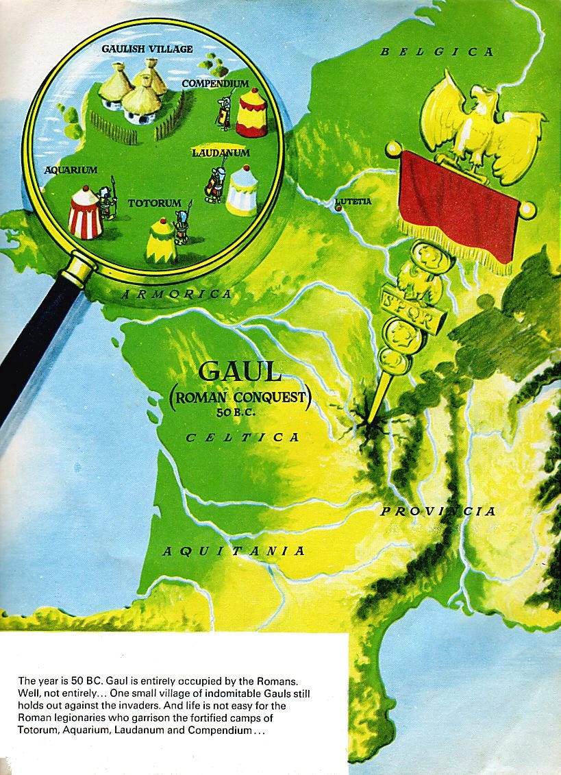 The series is set in Gaul around 50 BC, mostly in a village of Celtic warriors that is the only part of the region to not have been conquered by the Roman Republic. But here you must forget everything you know about Rome. Julius Caesar, starring as the prominent villain, is described as an emperor (he wasn’t). The various cultures encountered across the series — such as the Britons, the Goths, the Helvetes, and of course the Romans and the Gauls themselves — owe less to historical descriptions than to playful stereotypes of their modern equivalents (the Britons drink tea, the Goths wear the Pickelhaube, the Helvetes eat cheese fondue). Many historical events are referenced, but in anachronistic fashion. Much liberty is taken with technology and culture: the Gauls did not erect menhirs, for instance, despite the prominent role these stones play in the books.